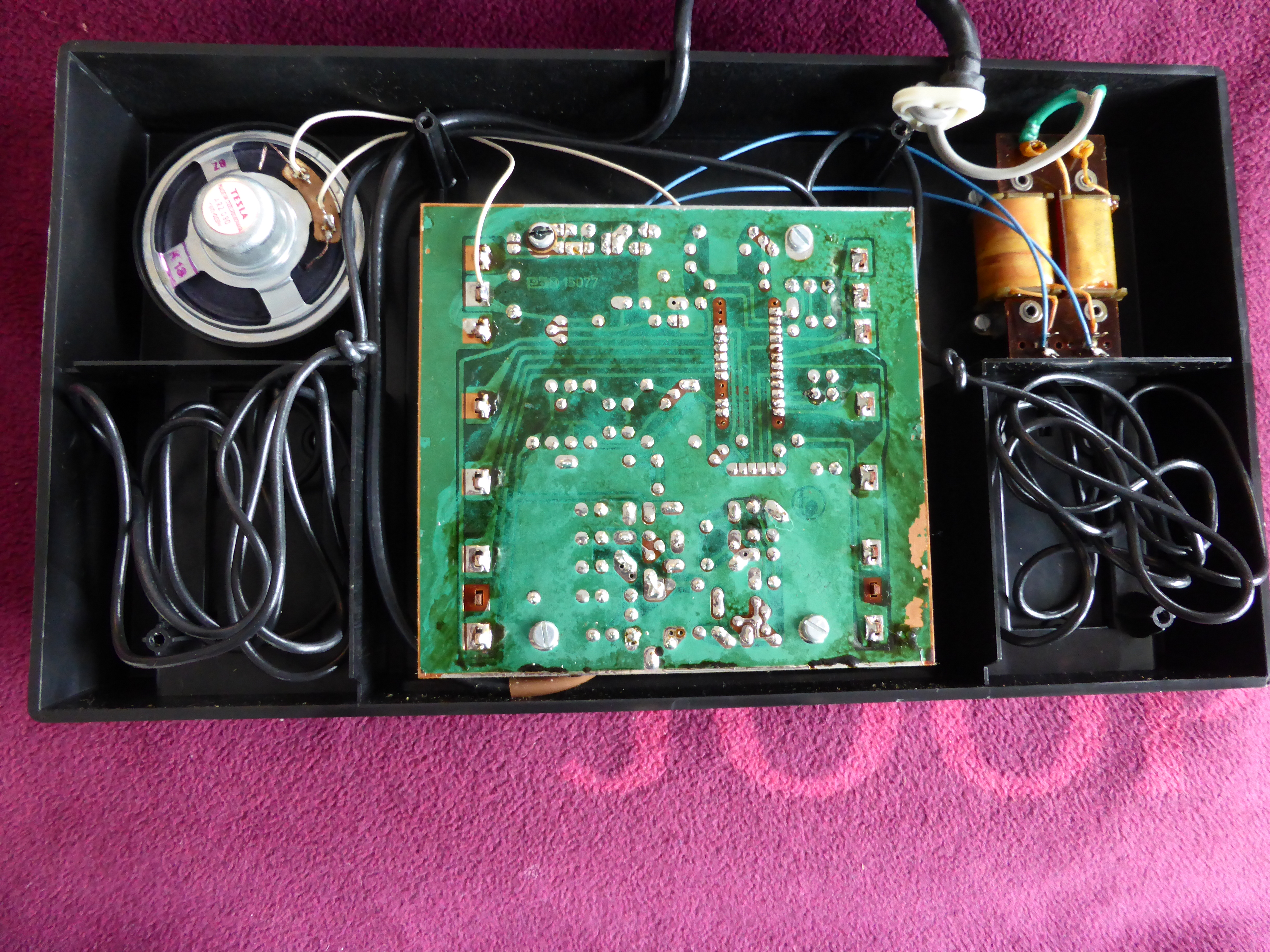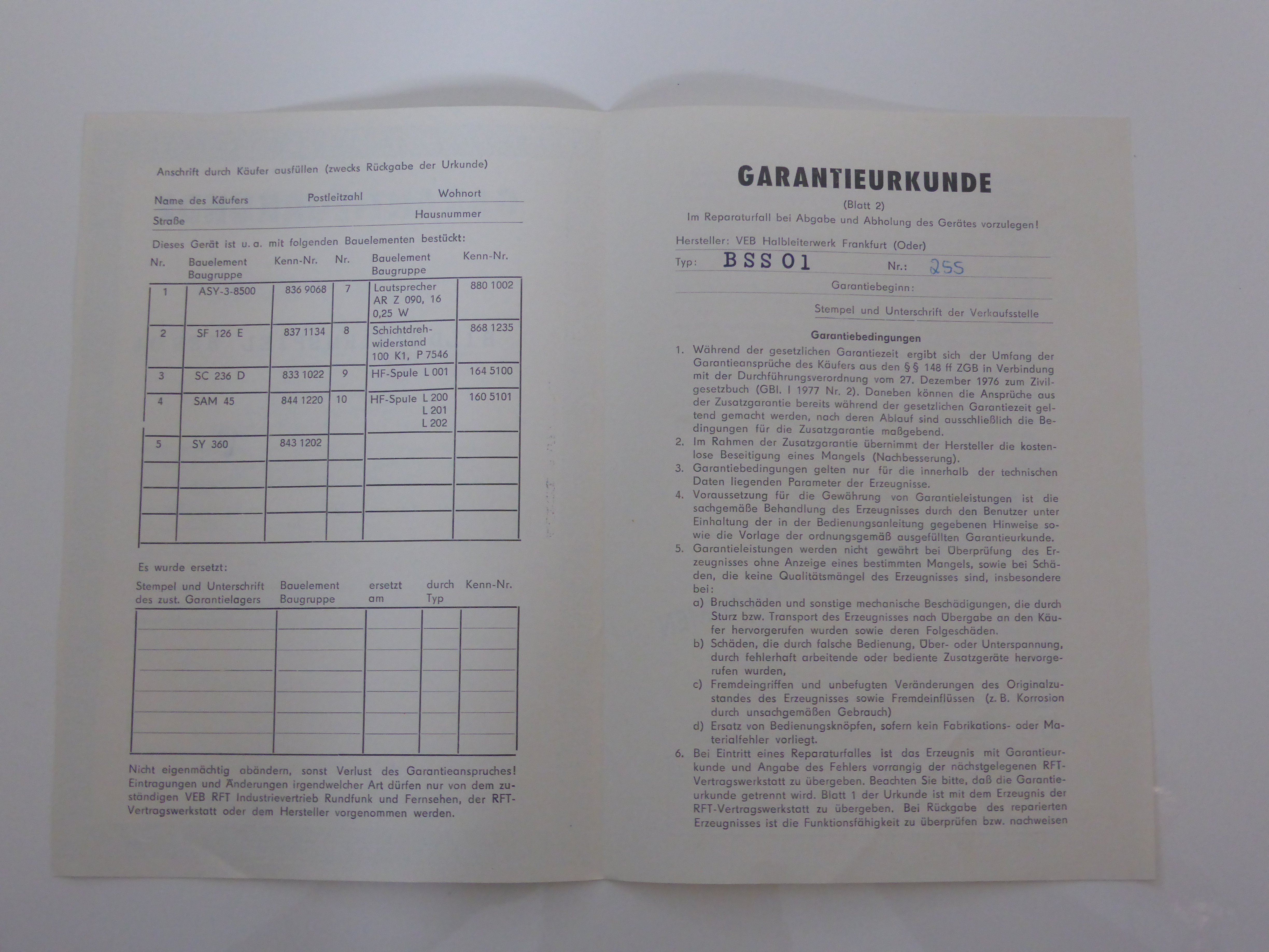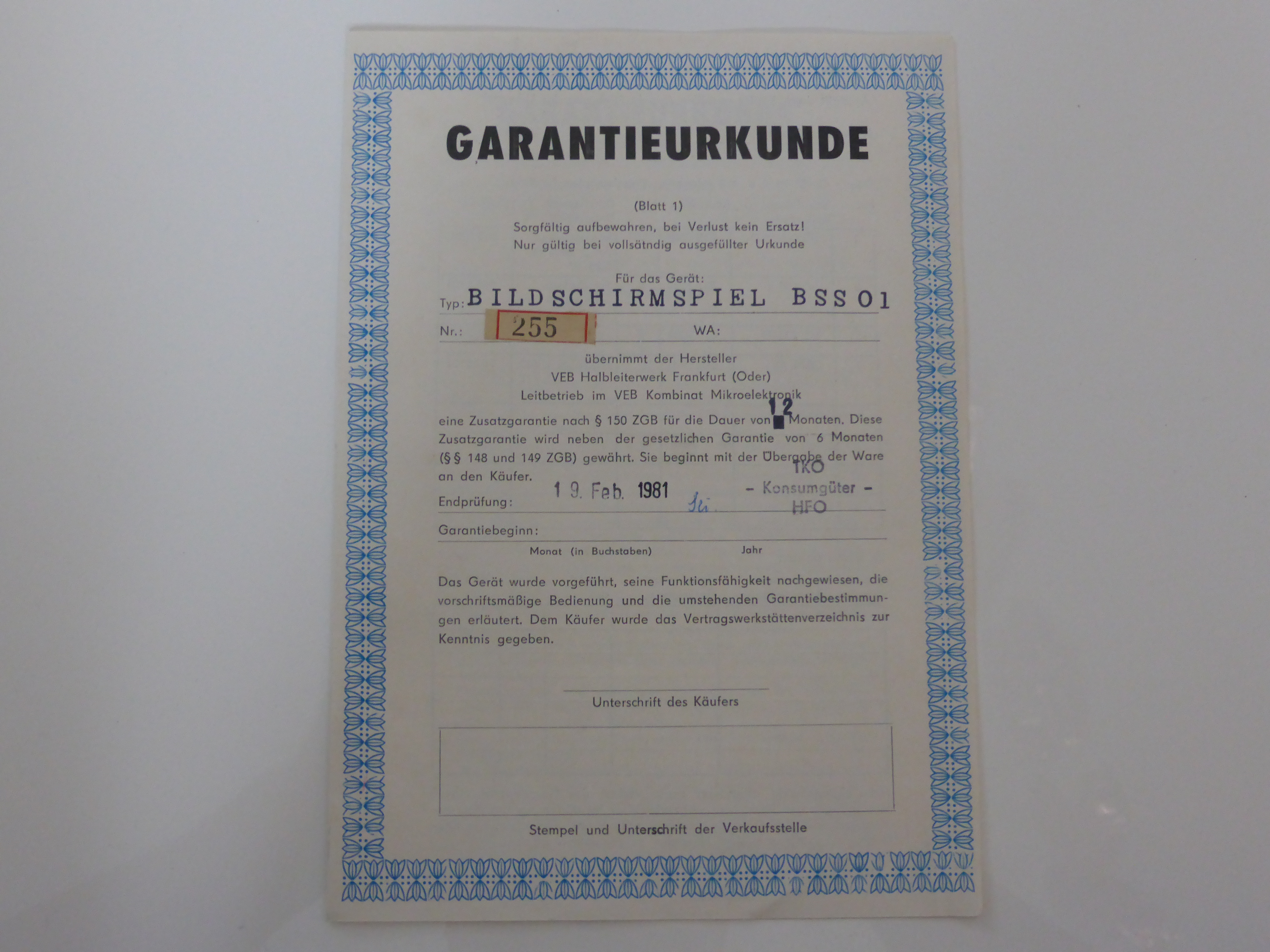 Erworben über eBay Kleinanzeigen im August 2022 von einem Sammler aus Burg Stargard (Mecklenburg-Vorpommern), der die Konsole selbst vor vielen Jahren noch zu DM Zeiten erworben hat. Als ich die Konsole erhalten habe, war diese tatsächlich noch ungeöffnet, beide rot lackierten Schrauben waren entsprechend noch original versiegelt. Ich habe als Erster und Einziger die Konsole nun geöffnet, um nach dem Herstellungsdatum auf der Platine zu schauen. Aber es ist kein Datum angegeben. Eine weitere Konsole mit der gleichen Einlegenummer ist auf https://retro-konsolen.de/rft-bildschirmspiel-01-bss01/ zu sehen.